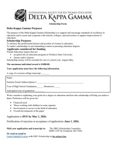 Scholarship Form Delta Kappa Gamma Purposes The purpose of the Delta Kappa Gamma Scholarship is to support and encourage standards of excellence in education and to assist and cooperate with schools, colleges, and universities to support improvement of education. Scholarship Purposes To advance the professional interest and position of women in education. To endow scholarships to aid outstanding women in pursuing education degrees. Applicants considered for funding Female Education majors that are: • accepted into an education program at Northern State University. • Juniors and/or Seniors. Scholarship money will be awarded for one (1) school year, August-May. The maximum individual award is $1000.00. Your application must have the following information. A copy of a current college transcript _______ Name Summer Email Address/phone # _________________________________________ Year of High School Graduation______ Hometown _____ Anticipated year of graduation ________ Write a narrative explaining your goals for a degree in education and how this scholarship will help you achieve them. Preference will be given for: • Financial need • Those working with children in some capacity • Involvement or service in the field of education • Overall development of the paper Application is DUE by May 1, 2026. Notification of rejection or acceptance of application: June 1, 2026. Mail your application and transcript to: The DKG Scholarship Committee 38895 110th St, Frederick, SD 57441 Or send an email to Carla.Clark@k12.sd.us with DKG Scholarship in the subject line.