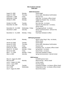 NSU Academic Calendar 2028-2029 2028 Fall Semester August 21, 2028 Monday Classes begin August 31, 2028 Thursday Census date, Attendance Confirmation September 1, 2028 Friday Payment due September 4, 2028 Monday Labor Day - no classes, offices closed October 9, 2028 Monday Indigenous Peoples’ Day - no classes, offices closed October 10, 2028 Tuesday Non-class day - no classes November 10, 2028 Thursday Veterans Day Observed - no classes, offices closed November 22 – 24, 2028 Wednesday – Friday Thanksgiving Break - no classes December 9, 2028 Saturday Winter Commencement - Johnson Fine Arts Center December 11 – 15, 2028 Monday – Friday Final Exam Schedule in effect 2029 Spring Semester January 15, 2029 Monday Martin Luther King Jr. Day - no classes, offices closed January 16, 2029 Tuesday Classes begin January 25, 2029 Thursday Census date, Attendance Confirmation January 26, 2029 Friday Payment due February 19, 2029 Monday Presidents’ Day - no classes, offices closed March 12 – 16, 2029 Monday – Friday Spring Break - no classes March 30, 2029 Friday Easter Break - no classes May 7 – 11, 2029 Monday – Friday Final Exam Schedule in effect May 12, 2029 Saturday Spring Commencement - Barnett Center 2029 Summer May 14 – August 10, 2029 Full BOR Summer Term May 28, 2029 Monday Memorial Day – offices closed June 4 – August 10, 2029 Full ten weeks June 4 – July 6, 2029 First five weeks June 19, 2029 Tuesday Juneteenth Holiday – no classes, offices closed July 4, 2029 Wednesday Independence Day – no classes, offices closed July 9 – August 10, 2029 Second five weeks