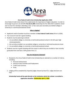 Applicant #________ (Credit Union use only) Area Federal Credit Union Scholarship Application 2026 Area Federal Credit Union (Area FCU) understands the importance of higher education. In order to encourage its pursuit, we will offer five (5) $1,000 scholarships for the 2026-2027 academic school year to Area FCU members attending a two- or four-year post-secondary accredited college or university or a technical/vocational school. Who is Eligible? Applicants and/or Guardian must be a member of Area Federal Credit Union (Prior to 2026). Your account must be in good standing. Students must be planning to attend: An accredited college or university or technical/vocational school in the fall upon high school graduation. Be currently enrolled in an accredited college or university or technical/vocational school. An accredited college or university or technical/vocational school. Students must be in good standing with the school in which they are enrolled or have recently graduated from and have a GPA greater than 2.5. How Are Recipients Selected? 1. Recipients of an Area Federal Credit Union Scholarship are selected on a number of criteria, including: Personal Achievement Extracurricular Activities and Employment Credit Union Services Essay 2. Judging will be completed by impartial judges chosen by Area FCU. Judges decisions are final. Scholarship funds will be paid directly to the institution which the scholar is enrolled in. Application deadline: Wednesday April 1, 2026