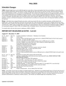 FALL 2025 Updated: 10/23/2025 Schedule Changes Adds--Standard-length classes can be added through term census date, as long as prerequisites have been met and there is room in the class, however students should check with the instructor of classes added after the start of class to be sure they are okay with the late add. Exceptions require department/dean overrides. Your advisor can help you make those requests and if approved, can set it up so you can register. Census dates for non-standard classes are determined on an individual basis. If your class has start and end dates that are different from the full-term, it is non-standard. Check the course on Self-Service Banner, search for sections to find the applicable deadlines for that class. Extra class activities, internships, individual studies and second-half semester classes should be added by term census date, as full-time status for athletic eligibility, insurance, and financial aid purposes is determined based on enrollment at census date. Refer to the Important Deadlines and Dates for each term. Drops—Individual classes dropped through census date, results in no record of the class on academic transcripts, and full refund for the dropped class. From the day following census date of the term until 70% of the term has passed, courses may be dropped, but the class with a 'WD' grade will be recorded on the transcript and no refund will be generated. As of Fall 2015, undergraduates are allowed six (6) ‘WD’ grades. After the sixth, a “WFL” grade is assigned. This counts like an F in gpa calculations. Drops may be processed via Self-Service Banner (SSB) or by contacting the Registrar’s Office in DH 103 (Graduate Office for graduate classes). Courses may not be dropped after the 70% point. You should confer with your advisor prior to making any ADDS or DROPS. IMPORTANT DEADLINES & DATES – Fall 2025 August 25 – December 17, 2025 Jul. 28 – Sept. 4 Mon.-Fri. Complete Attendance Confirmation – Mandatory for all students. August 25 Mon. Classes begin. August 29 Fri. Last day to drop a first half semester course and receive a refund (CENSUS date for First 8-week courses). September 1 Mon. Labor Day – no classes and offices closed. September 4 Thurs. Last day to drop/add a 16-week, standard semester course on SSB and receive a refund. Last day to withdraw from school and receive 100% refund (for standard length classes) Census Date (full semester [16-week] courses Attendance Confirmation must be completed. September 5 Fri. Payment Due in Full (student bills) October 1 Wed. Last day to drop/withdraw a first half semester course (no refund) October 13 Mon. Indigenous Peoples’ Day – no classes and offices closed. October 17 Fri. End of first half of semester courses October 20 Mon. Start of second half semester courses October 24 Fri. Last day to drop second half semester course on SSB and receive a refund (CENSUS date for Second 8-week courses). Oct. 27 – Nov. 14 Mon.-Fri. Registration for Spring 2026, Summer 2026 and Fall 2026 October 29 Wed. Last day to withdraw from school and receive pro-rated refund (60% date). MUST CONTACT THE REGISTRAR’S OFFICE. October 31 Fri. Last day to apply for December 2025 graduation. November 4 Tues. Assessment Day – Exit Exams given. No classes until 4 p.m. November 7 Fri. Last day to drop/withdraw from full term class or school. (no refund) November 11 Tues. Veterans Day – no classes and offices closed. November 26-28 Wed.-Fri. Thanksgiving Break – no classes (offices closed November 27th; November 26th is a non-class day) December 1 Mon. Last day to drop/withdraw second half semester course (no refund) December 10 Wed. Non-class Day (Final Exam Prep Day) December 11-17 Thurs.-Wed. Final Exams December 13 Sat. Winter Commencement – 10 a.m. Johnson Fine Arts Center NOTE: Census Date is the last day for refunds on standard-length classes. Refunds for non-standard-length classes are based on the percent of calendar days elapsed. Drops cannot be backdated. Financial aid is determined as of enrollment on the Census Date for each term. Any classes added or dropped after this date will not be used in determination of financial aid eligibility. However, all courses registered for the term are included in determination of satisfactory academic progress. This includes non-standard-length and correspondence courses.
